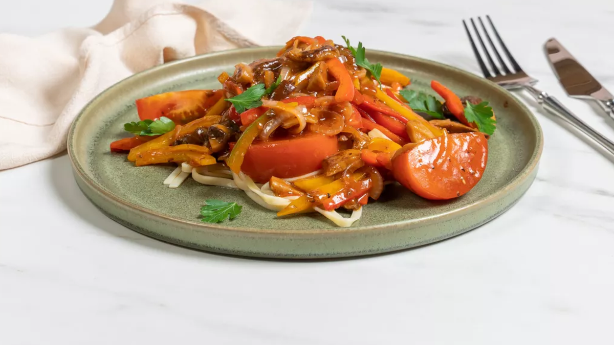 Разноцветное рагу, в котором ароматы белых грибов и свежего перца оттеняют и подчеркивают друг друга. Это необычное сочетание можно слегка смягчить и уравновесить, добавив помидоры и томатную пасту. Так рагу превратится в соус для спагетти или других макаронных изделий. Без томатной пасты овощи и грибы будут звучать в рагу более независимо друг от друга и хорошо подойдут в качестве гарнира к мясу и птице.
