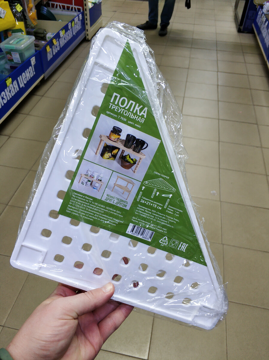 Приветствую, уважаемые! Хотела сегодня акции показать, на каких товарах можно сэкономить, покупая сейчас. Видимо, завтра покажу, потому как лучше новинки быстрее. Опять набралось фото товаров достаточно для большого обзора. Я, кстати, напоминаю, что ПРОМОКОДЫ на 50 рублей каждый день публикую в Телеграм канале, если вы не следите. Я уже на связи, ждем... А пока вот, начну с полок. Треугольные, мне кажется, это больше для кухни подходит, почему-то в отделе для интерьера выложили. Полка пластиковая, вот оборотная сторона: и этикетку тоже подробнее ближе покажу а тут инструкция по сборке, все детали в комплекте. Для детишек игры-балансиры появились, это из новой партии, посмотрите. описание, инструкция вложена. Разные есть, все коробки покажу стоят эти балансиры - 299 руб В отделе с косметичками и прочими опять появились новинки. Вот еще одни контейнер с несколькими секциями. Кстати, эти внутренние перегородки легко убираются, мыть удобно и если вдруг кому нужно без перегородок такой к