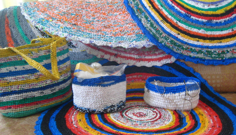 До чего же изобретательны рукодельницы в карельских городах и селах! Кто-то украшает дачные участки вырезанными из фанеры и раскрашенными акрилом фигурками мультяшных персонажей, кто-то строит домики из бутылок, кто-то использует пластиковую тару для создания садовых композиций, а предприимчивая пенсионерка Тамара Александровна Шалгунова из Эссойлы научилась вязать коврики, сумочки и корзинки из вторсырья. Главное преимущество изделий из мусорных и упаковочных мешков — доступность материалов. Современная жизнь, так или иначе, способствует зарастанию «сокровищами» в виде разного хлама, например, пакетиков с пакетиками купленных в магазине полиэтиленовых мешочков может накопиться столько, что с трудом закроется кухонный шкаф. Тамара Александровна нашла верный способ утилизации пленочного материала с пользой для экологии. Совсем недавно она стала вязать крючком разнообразные изделия из этого искусственного сырья. Для того, чтобы получилась симпатичная яркая сумочка, необходимо взять 60 па