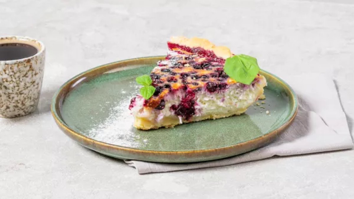 3. Для начинки смешайте сметану с творогом, яйцами и сахаром. Вылейте на тесто и выложите равномерно ягоды. Запекайте 40 минут.