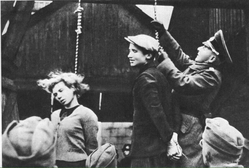 В Минске повесили 12 советских подпольщиков, помогавших раненым красноармейцам бежать из плена. На фото – момент подготовки к повешению Владимира Щербацевича. Слева – повешенная 17-летняя Мария Брускина.
