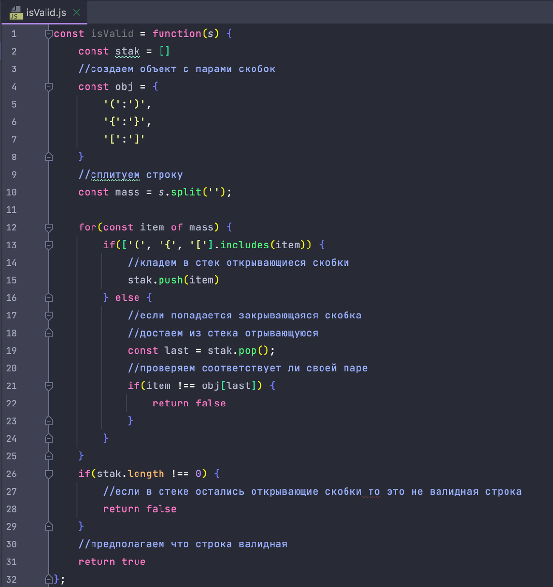 LeetCode(JavaScript) Дана строка str содержащая только символы (,),{,},[ и ], требуется опредлить является ли строка валидной. Строка считается валидной если выполняются следующие условия: Примеры: Чтобы решить данную задачу вначале разобьем строку, так сказать сплитуем, также нам нужен объект с помощью которого будем понимать что открывающейся скобке определенного типа, соответствует закрывающаяся того же типа и заведем пустой массив так называемый Стек. В целом алгоритм простой, мы проходимся по массиву со скобочками, если встречаем открывающуюся то закидываем ее в Стэк, в противном случае если встречаем закрывающую то проверяем является ли эта скобка парой для последней помещенной в стэк открывающей скобки, если нет то возращаем false (строка не валидна) если же мы прошлись по всему массиву и не нашли ошибок а так же проверили все помещенные в Стек открывающие скобки то возвращаем true и считаем что строка валидна. //Решение Codesandbox P.S.: Свои варианты решения пишите в коммента
