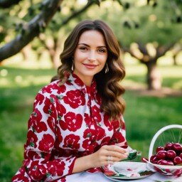 Вика стала натягивать вещь, втайне боясь, что блузка не налезет. Но села, как влитая. Классическая, английская, правда ягоды на ней были больше, чем нужно, чтобы вещь оставалась в рамках классики. Но эти большие,и жизнерадостные, хулиганские вишенки здорово подняли настроение . С джинсами + самое то.