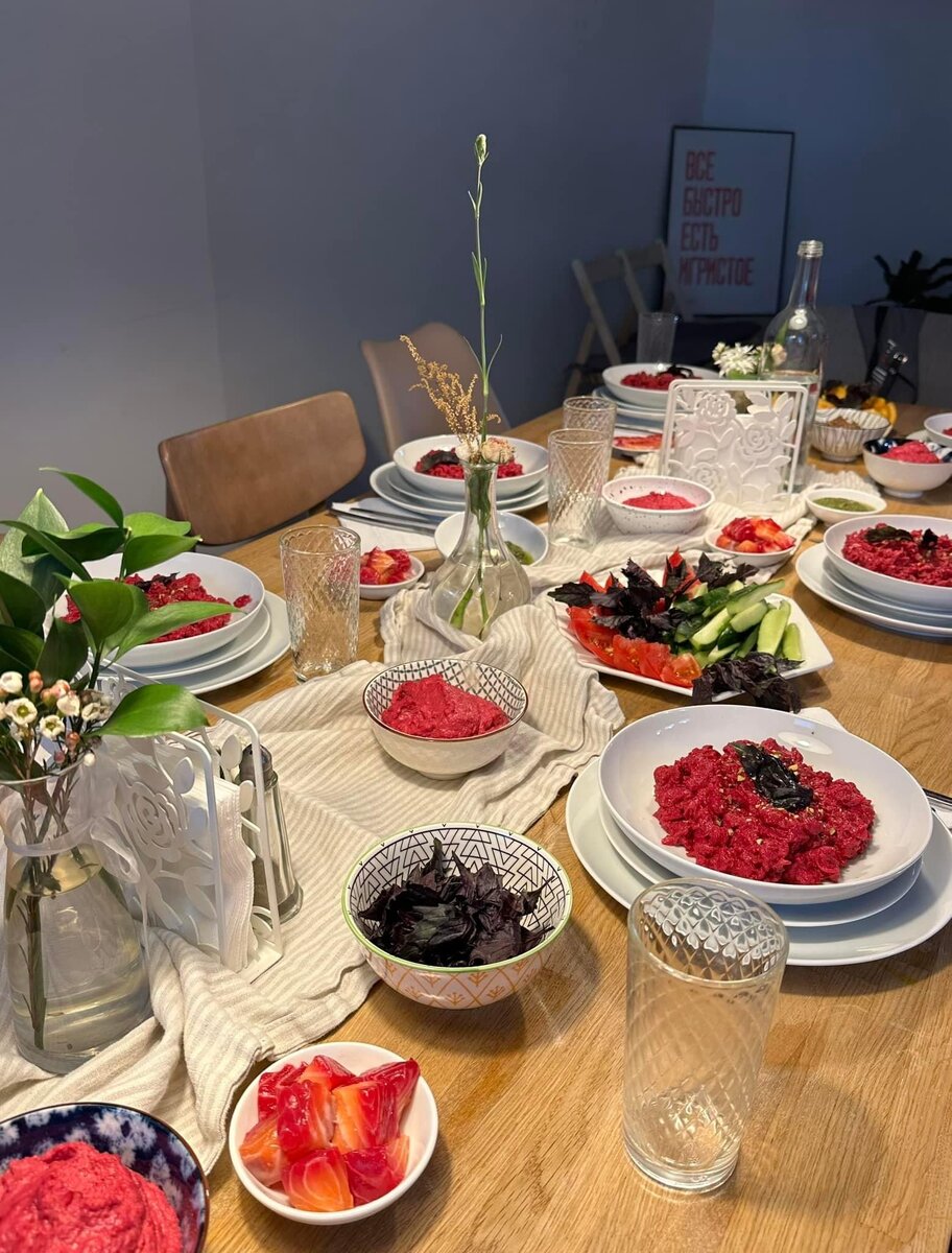 9. Салат из свеклы, салатных листьев, кешью, лука и каштанов.