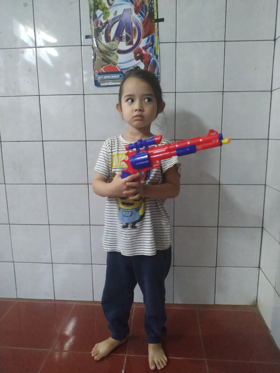 В предыдущей статье я писала, как Амира собрала пистолет из конструктора и бегала с ним, изображая Грэнпа. Я должна была ходить за ней с неким подобием дубины, изображая Грэнни - такая вот игра. Мне так играть совершенно не хотелось, поэтому на следующий день мы пошли в магазин игрушек. Дитё минут десять выбирало там себе пистолет. - Мама, мне надо этот! Нет, вот этот хочу! Оооо, какой! Мне зелёный! Нет, мне оранжевый! О, какой большой! Смотри, мама, тут два - один Амире, второй маме! Мне понравилась цена набора - около 180 рублей в пересчёте. С моего дня рождения ещё оставались деньги (платье купила со скидкой 260 рублей). В наборе два пистолета, 18 шариков и 4 присоски. Дитё быстро научилось стрелять из двух сразу, а вот зарядить пока сил не хватает - тугой затвор, поэтому заряжать приходится мне. Но играем с большим удовольствием - стреляем по эвенджерам, нарисованным на упаковке от этих самых пистолетов! .