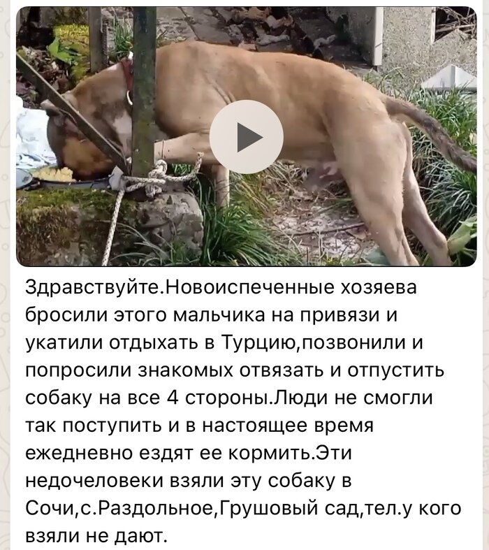 Месяц назад, владельцы этого мальчика, бросили его, привязав его на улице. Сами же уехали отдыхать в Турцию. Добрая душа Владимир, ходит подкармливать его, но отпустить не может. Собака домашняя. Порода на первый взгляд пугает и если увидеть такого пса бегающим на улице, будет много возмущений и его жизнь будет в еще большей опасности, чем сейчас. Возможно среди нас найдется тот кто готов будет забрать его и дать любовь, которую он не получил от своих прошлых хозяев. Г. Сочи, с. Раздольное, Грушевый сад. Есть номер телефона для связи с Владимиром. По всем вопросам, можете написать мне. Пост автора streltsova.k. Комментарии к посту на сайте Пикабу.