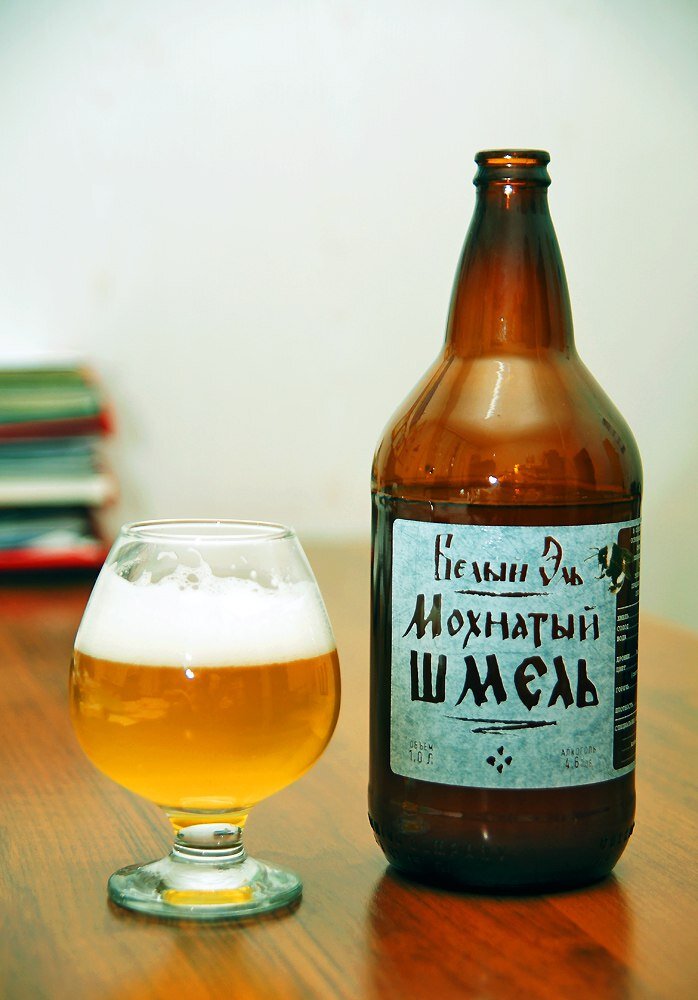 Пивные «консервы» все равно нужно добивать. Сегодня – осень 2015-го. Потерпите, осталось немного. ))) В январе 2016-го я с пивом наглухо завязал. На добрые почти шесть лет… Белый эль МОХНАТЫЙ ШМЕЛЬ (МПК, 11/4,6) Шмеля-альбиноса купил в "Рыбной лавке" по наводке Сергея Фандикова. Последнюю бутылку. Если б не он - так и ходил бы трезвый.))) Интересное развитие событий - после традиционного эля сделать бельгийское пшеничное белое пиво. Первое впечатление - легкий вариант "Хугардена". Менее горький на вкус, хотя хмель в послевкусии ощущается. Пена богатая, сходит средне, белоснежная, но показался слегка сероватый оттенок. Немного леденцов на выдохе. Апельсиновая цедра, кориандра мало, но это, ей-богу, не беда. ))) Со временем замечаются фруктово-конфетные нотки. Тело пива легкое, но ни разу не водянистое. В составе помимо хмеля-дрожжей-солода-воды, присутствует пшеница, апельсиновая цедра и кориандр. В общем - вит в бельгийском стиле, чуть легкомысленный, но питкий. Любителям такого пива