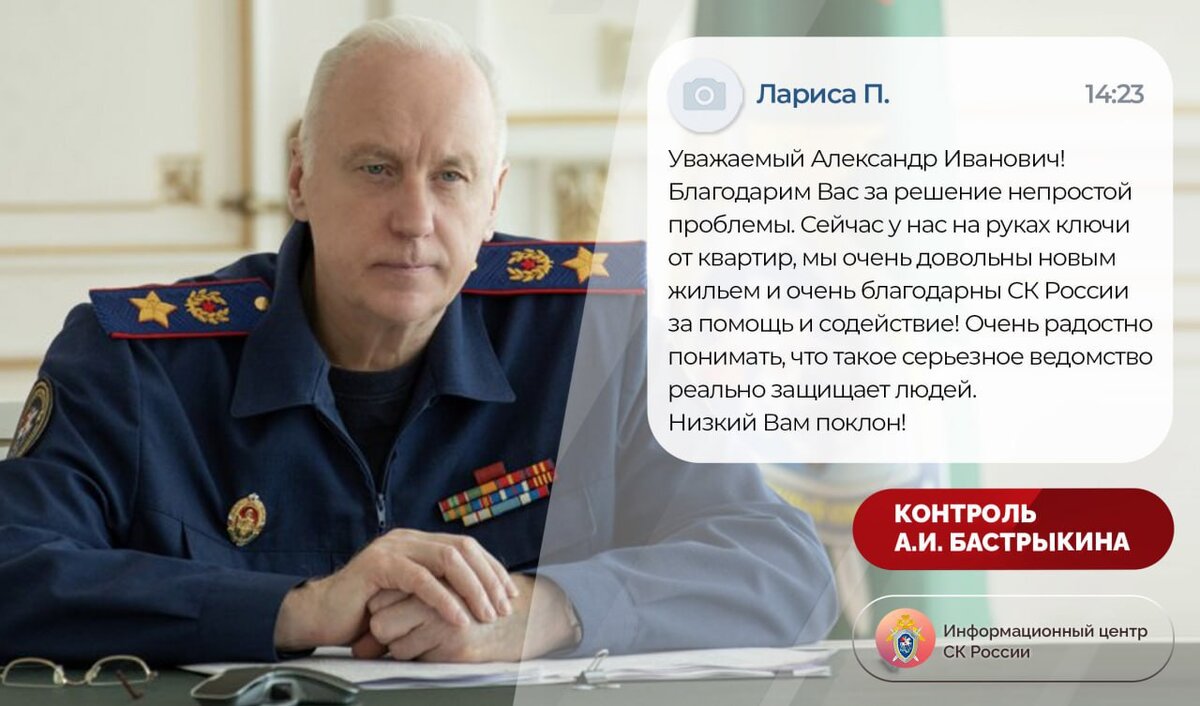 Кроме того, переселенцы направили благодарность лично Председателю СК России А.И. Бастрыкину в его Приёмную «ВКонтакте» со словами: «Уважаемый Александр Иванович! Благодарим Вас за решение непростой проблемы. Сейчас у нас на руках ключи от квартир, мы очень довольны новым жильем и очень благодарны СК России за помощь и содействие! Очень радостно понимать, что такое серьезное ведомство реально защищает людей. Низкий Вам поклон!»