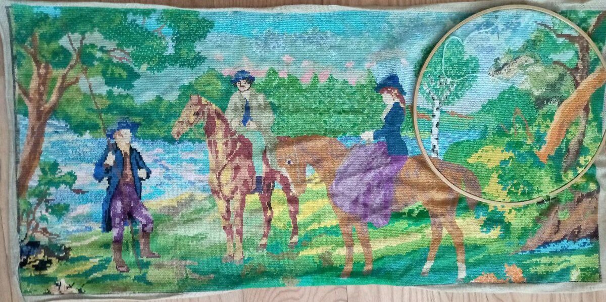 Спустя 5 месяцев я решил снова показать ход вышивания своей картины. Конечно, можно и чаще выставлять этот процесс в соцсетях. Но всё же, я это делаю, когда результат более весомей. Этот промежуточный результат, наверное, будет последним. Потому что остался совсем маленький не вышитый участок. Работа продвигалась бы, возможно, быстрее. Но рисунок на канве уже плохо виден, и приходится домысливать, какие оттенки ниток использовать в определённый момент. Так получилось с деревцем. Было оно невзрачным, и непонятным на этой картине. Поэтому мне пришла в голову сделать берёзку. На мой взгляд, она вполне вписывается в общий фон. Для того чтобы более-менее берёзка была схожа, по виду, с настоящим деревом, пришлось найти в интернете схему, как-то похожую по размерам. А ещё чуть продлил речку за всадниками. Она уходит постепенно за холм, и, теряется в зелени. И конечно же, разнообразил краски неба. Ведь оно редко бывает одного оттенка. Кроме этого, на небе плывут облака и тучки. Почти как у Тю