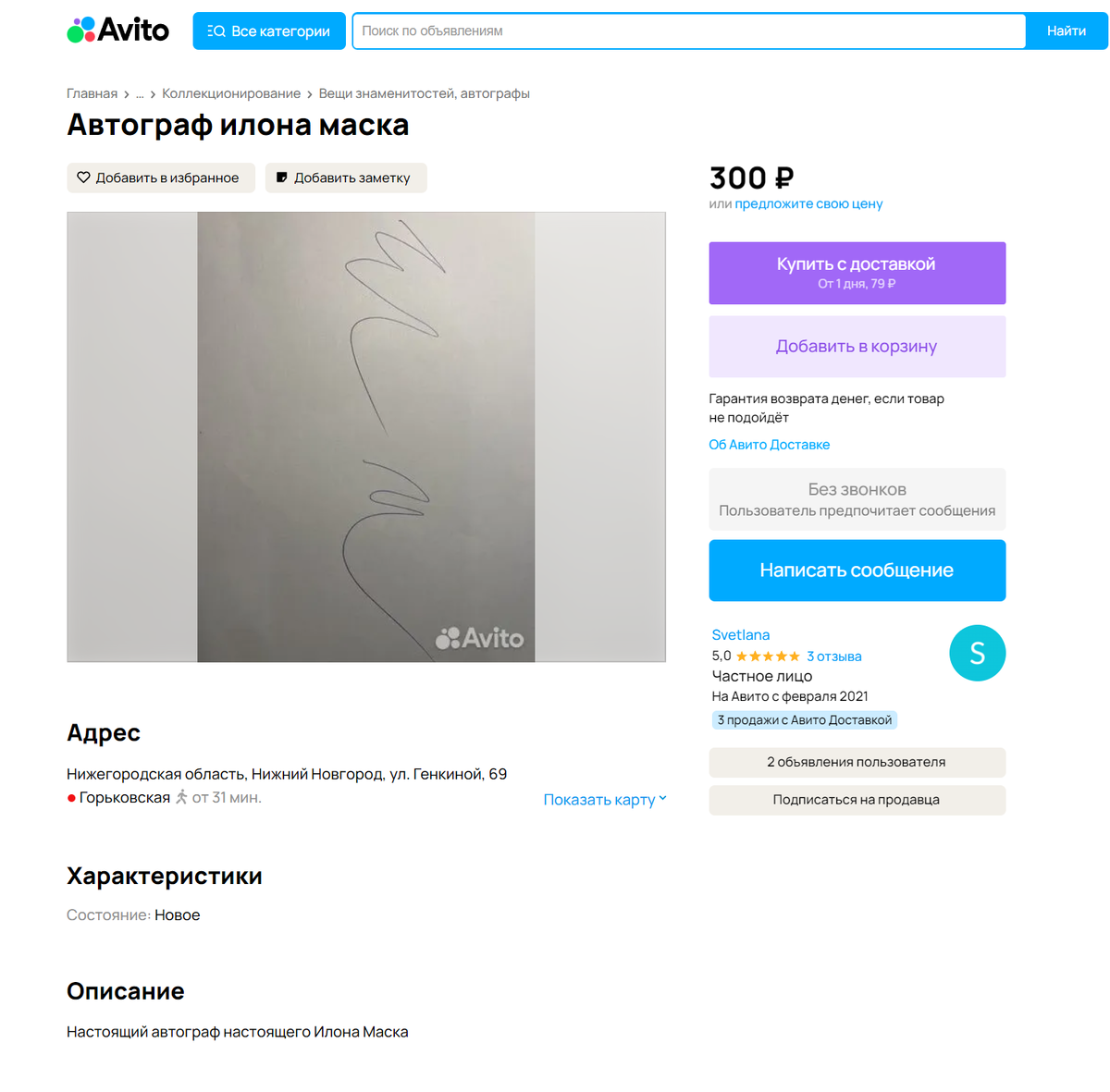 Авито. Мечтаю купить автограф Илона Маска. Не могу определить подлинный!!!)))