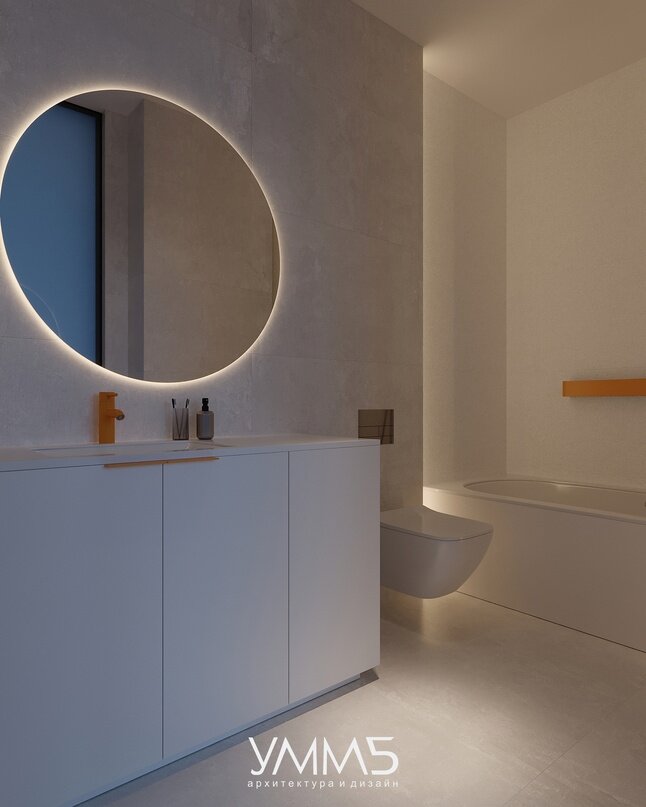 Из гостевой комнаты есть доступ в отдельный санузел, который также был архитектурно неровной формы. Так вдоль одной из стен образован выступ, за которым установлена ванна, оформленная белой фактурной плиткой и отдельным светом. Всё остальное помещение выполнено в нежно-серой гамме с яркими акцентами оранжевого цвета, такими как подвесная полочка в ванне и кран у раковины. Под раковину спроектирована напольная тумба и сверху подвешено круглое зеркало с подсветкой.