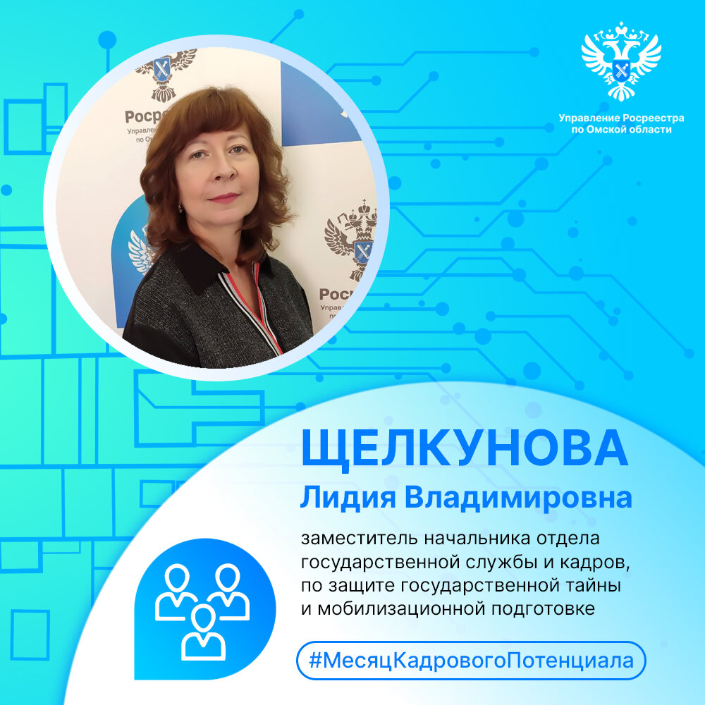 Знакомьтесь: Щелкунова Лидия Владимировна – заместитель начальника отдела государственной службы и кадров, по защите государственной тайны и мобилизационной подготовке Управления Росреестра по Омской области