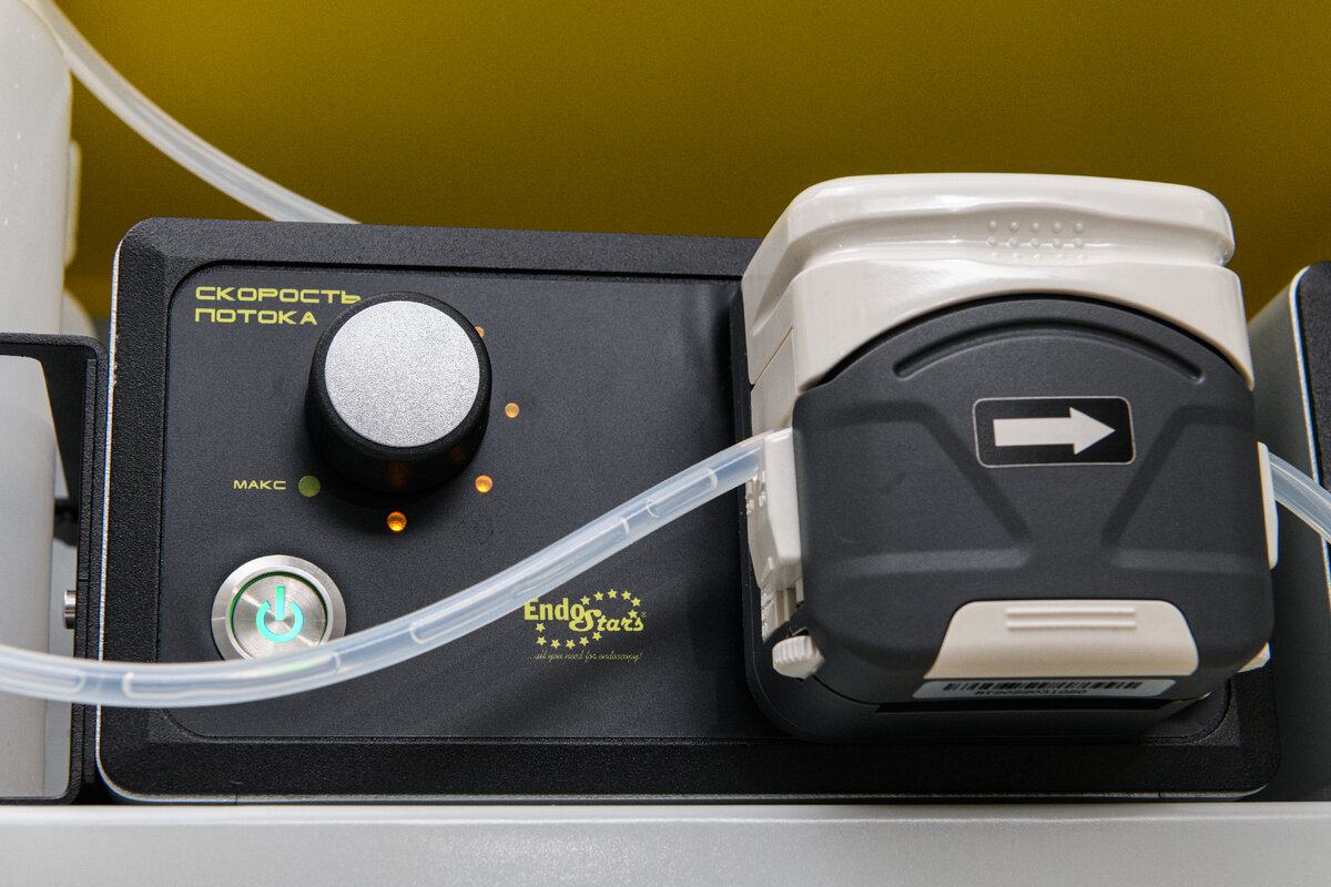 При тоннельных вмешательствах помпа должна идти в паре с JET-каналом эндоскопа, она помогает на этапе отмывания и подготовки поля операции, и незаменима в пространстве тоннеля. Ограниченный объем очень быстро заполняется кровью при кровотечении, поэтому своевременный гемостаз имеет основополагающее значение. Использование ножной педали, а не сил ассистента для отмывания, помогает контролировать оперирующему специалисту весь процесс операции.