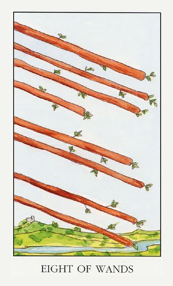 8 Жезлов. Сегодня будет активный день наполненный оптимизмом и удачными обстоятельствами. 8 Жезлов означает скорость - все дела складываются как надо, решения принимаются вовремя и правильно. Это знак удачи, быстрого исполнения задуманного - но только если вы не будете сидеть на месте в этот день а будете активно лоббировать свои интересы. Также сегодня могут поступить важные для вас известия, как ожидаемые, так и неожиданные.