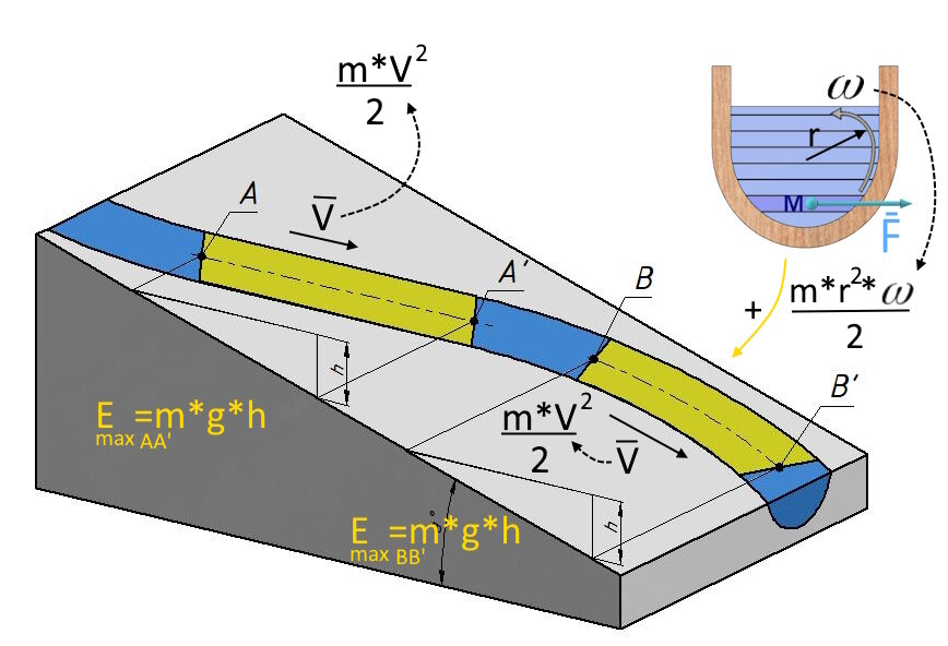 На участке AA' эта m*g*h переходит в кинетическую энергию движения вдоль русла.