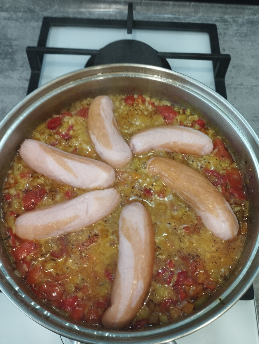 Приветствую всех! Сегодня рекомендую вкусный рис с овощами, с добавлением сарделек..... Итак, приступим! Нам нужно: Лук репчатый 1-2 шт. Баклажан 1 шт. Средний Морковь 1 шт. Перец болгарский 1 шт. Сардельки 2-3 шт. Рис 250 г Соль и приправа по вкусу. Нарежем овощи Что делать: Добавляем воды 3 стакана, солим, перемешиваем, кладём приправу по вкусу. Ждём, когда набухает рис(10-15 минут) . Приятного аппетита!!!!!!!