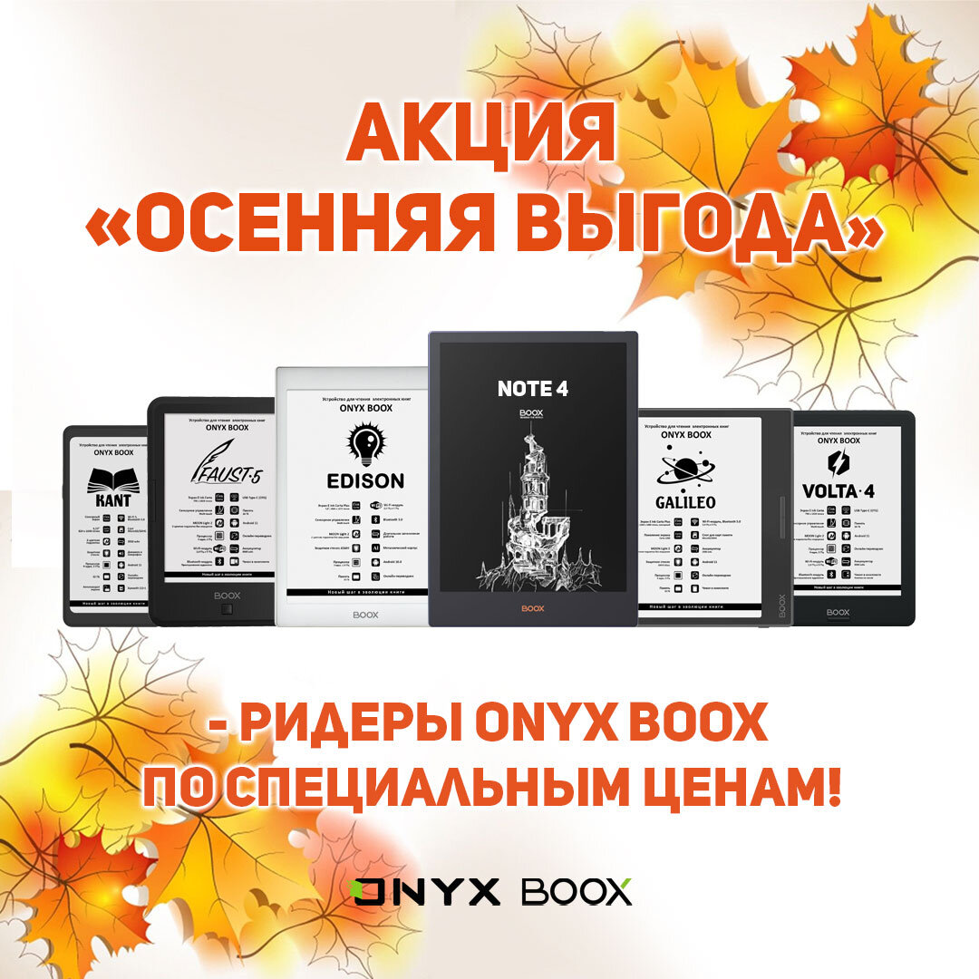 Сегодня у нас стартует осенняя акция. В период с 29 сентября по 9 октября ряд популярных моделей ONYX BOOX можно будет приобрести со скидкой.