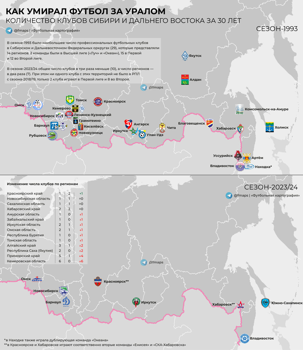 Последние несколько лет в контексте проблем нашего футбола часто обсуждается тезис о медленной смерти футбола за Уралом (а ведь это 2/3 территории и более 15% населения страны). Я решил визуализировать этот тезис. Ситуация действительно печальная. Эту и другие интересные карты и инфографику о футболе вы можете увидеть в Телеграм-канале «Футбольная картография». Подписывайтесь, чтобы не пропустить обновлений! В сезоне-1993 было наибольшее число проф. клубов в Сибирском и Дальневосточном Федеральных округах (29). Они представляли 14 регионов. 2 команды были в Высшей лиге («Луч» и «Океан»), 15 в Первой и 12 во Второй лиге. В сезоне-2023/24 общее число клубов стало в три раза меньше (10), а число регионов — в два (7). При этом ни одной команды с этих территорий не было в РПЛ с сезона-2018/19, и только 2 клуба играют в Первой лиге и 8 во Второй. В 10 регионах команд стало меньше или не стало совсем, в трёх их число не изменилось. И только в Красноярском крае их стало на одну больше благодар