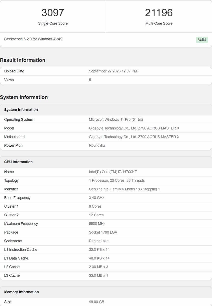Процессоры Intel Core 14 поколения ожидаются в продаже уже текущей осенью, а пока мы можем взглянуть на результаты тестирования одной из новинок в Geekbench 6. Протестированный в этот раз процессор, судя по всему, был разогнан, на что намекают частоты буста до 6 ГГц при "заводских" значениях саморазгона до 5,6 ГГц. i7-13700K в этом же тесте набирает 2817 и 17407 баллов за однопоток и многопоток соответственно, но стоит также учесть, что у i7-14700K и KF на 4 маленьких ядра больше, чем у предшественника, что также сказывается на многопоточной производительности. И да, в спецификациях процессора о 6 ГГц ничего не написано, но эти данные есть в частотных показателях теста.