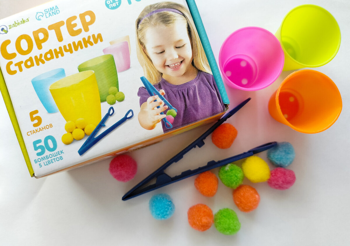 Игра на развитие мелкой моторики и кисти рук малыша, речи, изучение цвета, внимания, ловкости. Не так уж и просто управлять пинцетом и класть бомбошки в стаканчики. Всё это можно развивать,играя в сортер со стаканчиками и бомбошками. Малыш сам соотносит цвет бомбошки и стаканчика, сам их распределяет. Отличный вариант для изучения цвета. Также можно позже подключить и счёт. Если сразу сложно играть с пинцетом, предложите малышу просто брать двумя пальчиками бомбошки, указательным и большим - пинцетный захват. Он играет огромную роль в развитии речи ребенка. Так же можно начать играть с двух стаканчиков и цветов, например,жёлтый и зелёный. И постепенно добавлять по цвету. Можно,кстати,на коробку наклеить мордочку зайчика или любимого животного малыша. На месте рта сделать круглое отверстие размером с бомбошку. И кормить с пинцета, оранжевыми бомбошками ( морковкой), зелёными (капустой), жёлтыми (груша) и тд. Полезных вам занятий!
