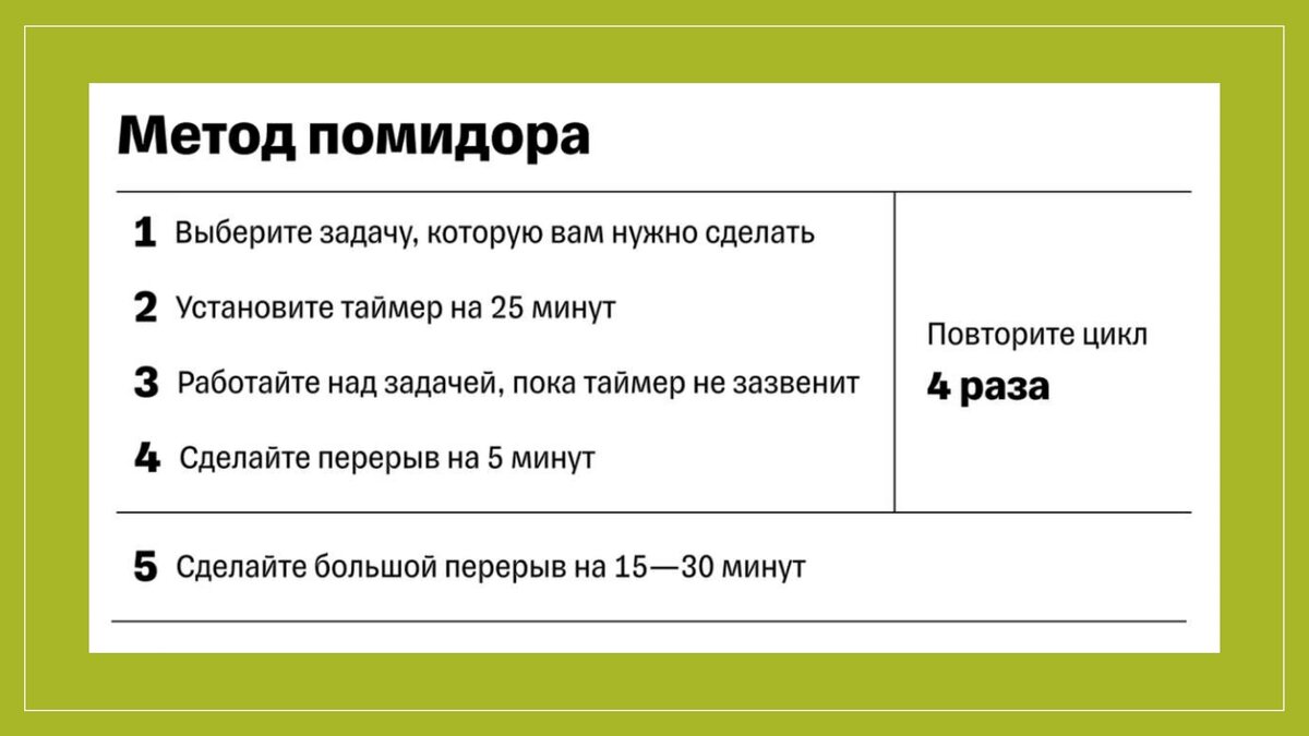 Недавно наткнулась на одну очень интересную картинку Суть техники проста: нужно завести таймер на 25 минут и работать, не отвлекаясь. По сигналу таймера нужно сделать пятиминутный перерыв. Затем следует чередовать работу и отдых с одинаковыми интервалами. Рабочее время от звонка до звонка — спринт или один помидор. Причём здесь помидор? Пока не поняла но в этой методике есть рациональное зерно. Когда ты знаешь, что через 15-20 минут тебя будет ждать перерыв на кофе, работа сразу становится более интенсивной, а продуктивность возрастает. Заинтересовалась, причём здесь все-таки помидор? Оказывается, автор методики, а именно Франческо Чиррило заводил свой кухонный таймер в форме ВНИМАНИЕ!!!!!!! помидора на 10 минут, чтобы проверить, сможет ли он не отвлекаясь учиться на протяжении этого времени. Его томатный эксперимент по самоконтролю удался. Вот вам и помидор))) попробуйте этот метод. Всем добра))