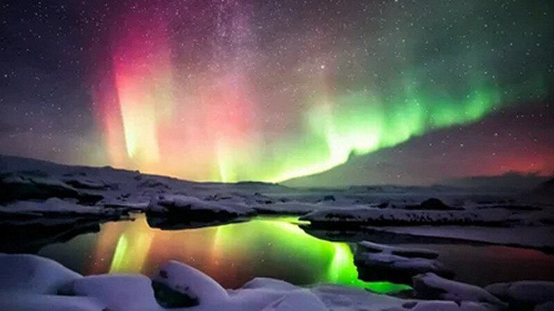 «Северное сияние» возникает в результате столкновения заряженных частиц Солнца с молекулами газов в верхних слоях атмосферы нашей планеты. Эти молекулы под воздействием солнечного ветра начинают колебаться и двигаться вверх, образуя светящиеся полосы и пятна разных цветов.