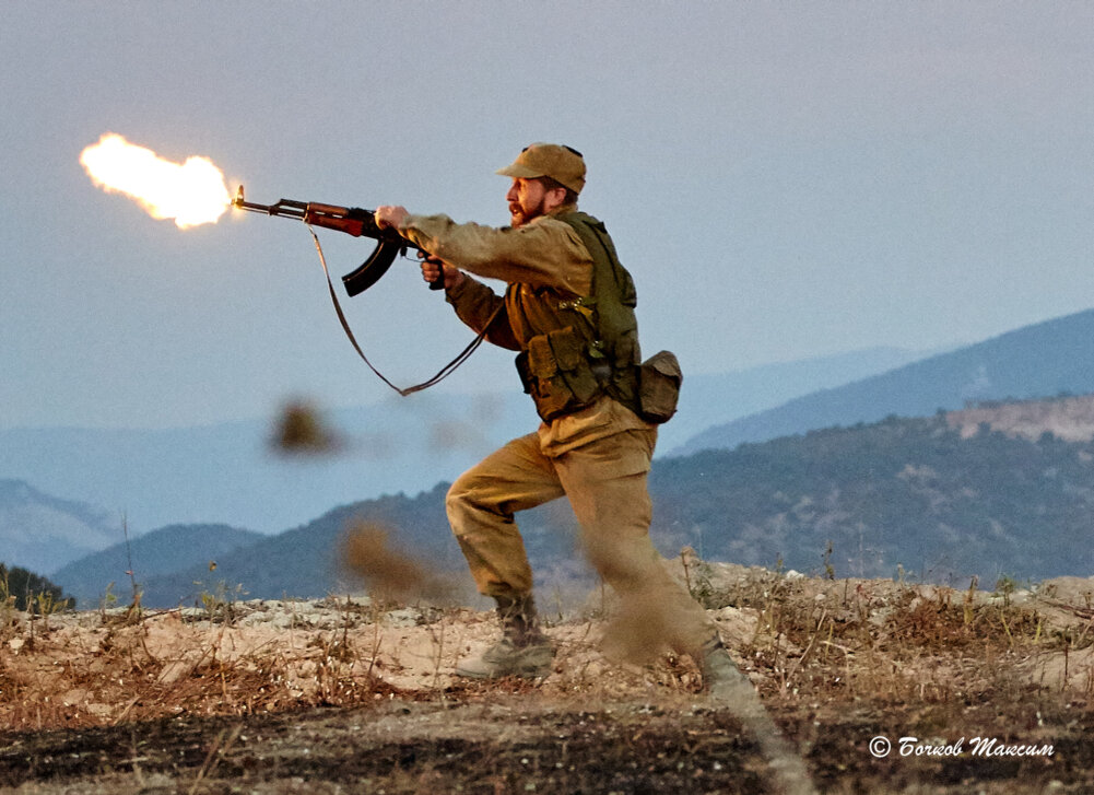 От окопов подбежал мужчина лет сорока, с густыми седыми волосами и такой же бородкой, одетый в новенькую форму цвета «олива», на плече поправил старенькую М14.