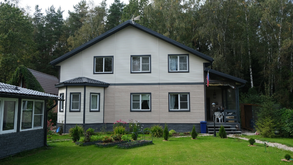 Отдельная радость для нас - посещать объекты, которые были сданы более года назад. За это время заказчики успевают обустроить быт, сделать дом уютным, гостеприимным, таким, каким он задумывался еще при заключении договора. Один из таких объектов мы посетили недавно. Это каркасный дом по индивидуальному проекту в поселении Кокошкино. Дом имеет большую площадь - 196,2 кв. м при габаритах 12,2 на 12 м., но несмотря на это, он не выглядит громоздким. А все за счет интересной наружной отделки из винилового сайдинга в двух молочных оттенках. В экстерьере также предусмотрены акценты - это ламинированное остекление, графитовая кровля с водосточной системой и цоколем в тон. Не можем не выделить и красивый эркер на первом этаже - он увеличивает площадь дома, сейчас в этом пространстве находится обеденная зона. Настоящим местом притяжения в доме стала гостиная со вторым светом. За счет большой площади остекления она получилась очень светлой и уютной. Мы не могли оставить этот дом без отдельного в