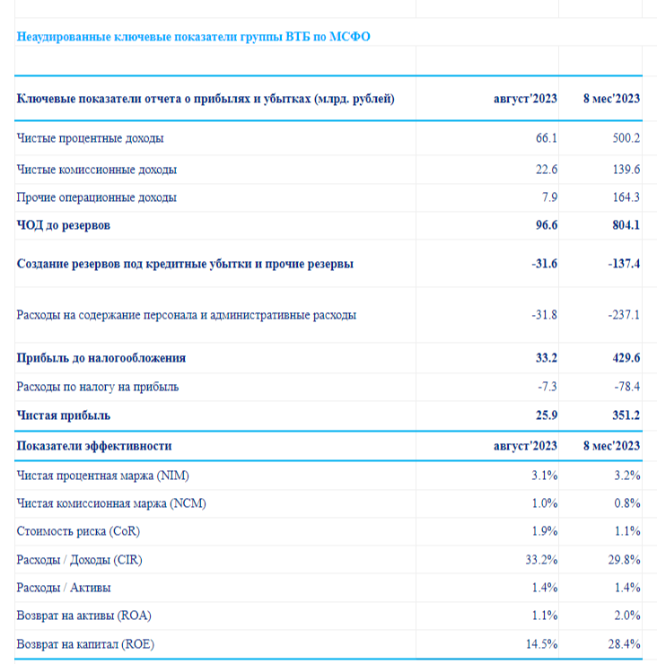 ВТБ отчитался за август и 8м 2023г., банк продолжает генерировать прибыль, но ужесточение ДКП повлияло на прибыль