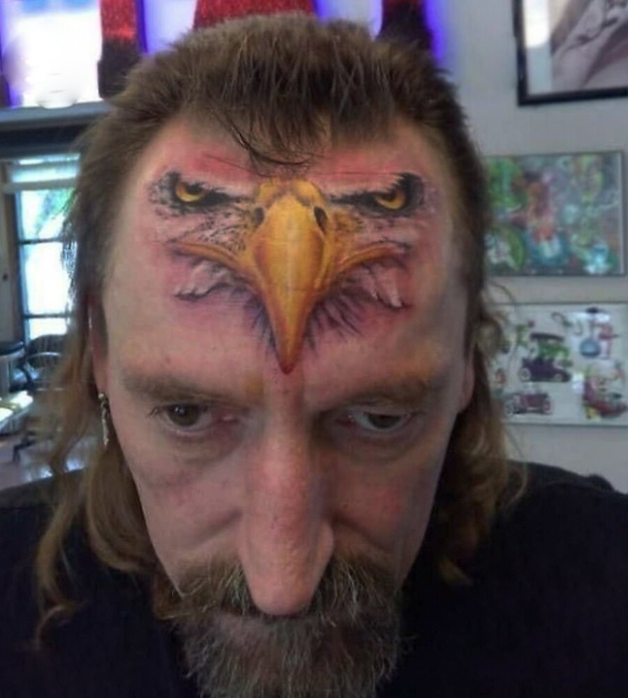 Мужчина решил продублировать свое лицо на лысом затылке, причем подошел к этому «творчески». Имеющий роскошные усы и бороду спереди, он, используя свою буйную рыжую растительность, повторил эти черты и на своем «заднем» портрете. Разумеется, он попросил татуировщика уделить особое внимание цвету глаз, и как мы можем догадаться, спереди они у него тоже голубые.