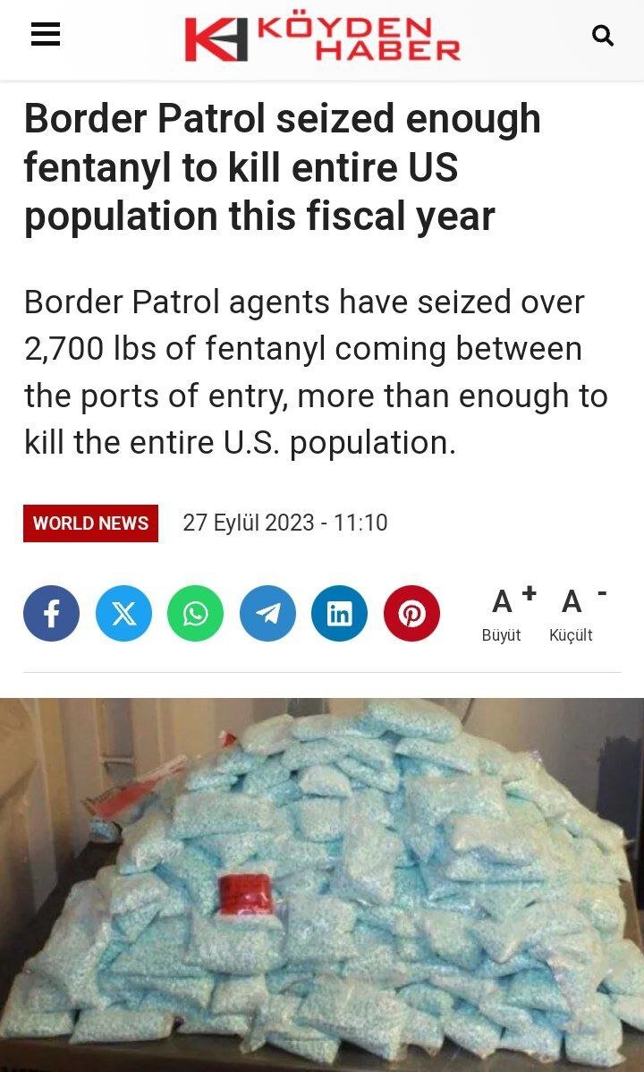 🇺🇸 На границе США за год изъяли достаточно наркотиков, чтобы убить всех американцев⚠️☝️ 💬 В этом году пограничная службы США изъяли достаточно фентанила, чтобы убить все население страны. Общий вес наркотиков—более 31 тонны (свыше 50,6 млн таблеток). Фентанил считается одной из главных угроз для США, так как это вещество в 50 раз сильнее героина. Большая часть партий попадает в Штаты из Мексики.
