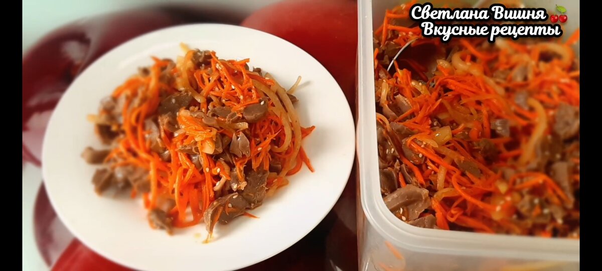 Всем привет! В этой статье поделюсь рецептом закуски в азиатском стиле. Блюдо готовится несложно, получается пикантная на вкус закуска. Можно приготовить к празднику и дополнить стол этим вкусным салатом. Продукты для приготовления: 1 кг. куриных желудков. Крупная луковица. Крупная морковь. Для варки желудков: Вода ~ 2,5 л. Соль по вкусу. Лавровый лист. Маринад: Соевый соус - 3 ст. л. Мёд - 2 ч.л. Уксус 9% - 3 ст. л. Паприка - 1 ч.л. Приправа для моркови по-корейски по вкусу. Кориандр по вкусу. Чеснок - 5 - 6 зубчиков. Приготовление: 1. Желудки промываем и очищаем от плёнок. 2. Кастрюлю с водой ставим на сильный огонь. Доводим до кипения и опускаем желудки. Как только вода снова закипит, снимаем пену и добавляем соль и лаврушку. Огонь убавляем и варим до мягкости на огне ниже среднего 1 - 1,5 часа. 3. Крупную луковицу (200 граммов и больше) очищаем и нарезаем полукольцами. Кладём в глубокую миску, заливаем горячей водой. Ставим в микроволновку. Прогреваем 1 минутку, чтобы лишняя