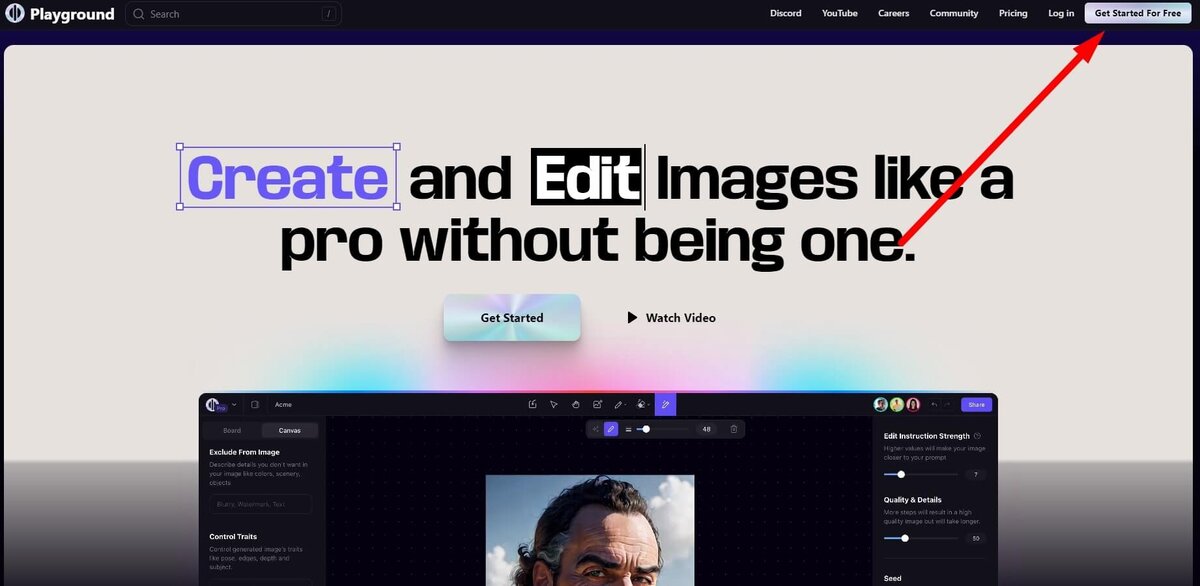 1. Чтобы создать аккаунт, зайдите на официальный сайт Playground Ai и нажмите на «Get started for free».