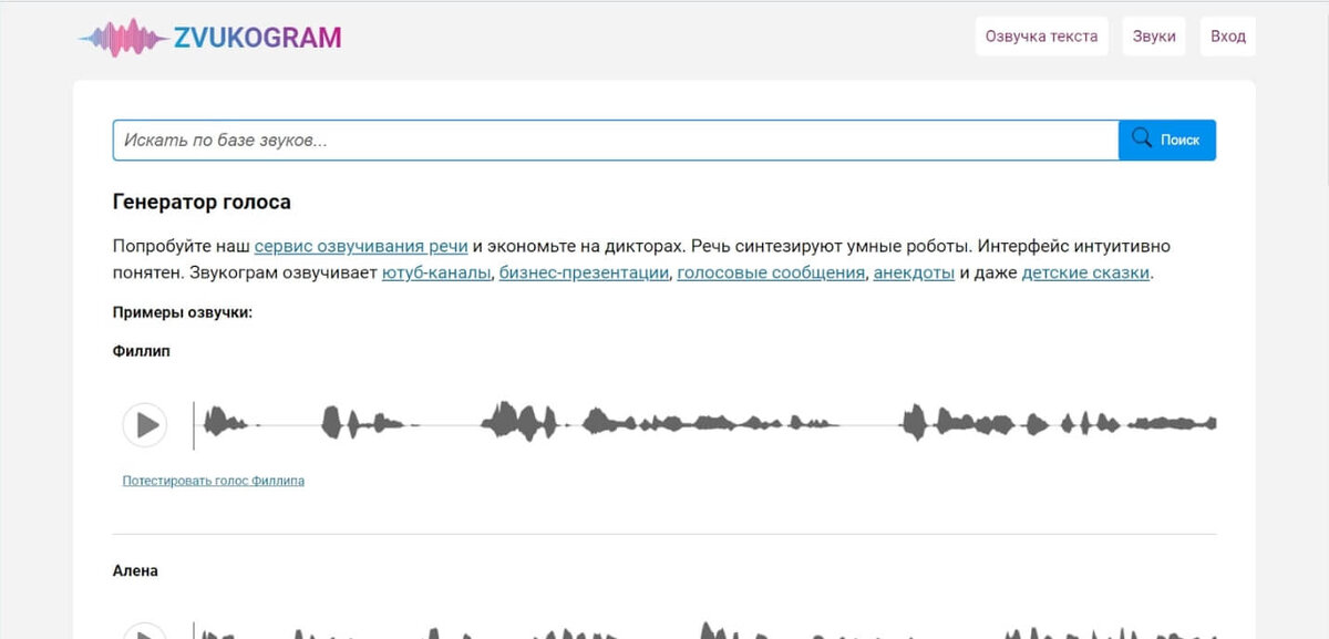 Zvukogram – сервис для озвучки текста человеческим голосом, с выбором тембра, интонации и скорости речи. Есть также варианты озвучки голосом робота. Содержит разбитую по категориям библиотеку голосов, которая постоянно пополняется – на данный момент в ней несколько десятков женских и мужских голосов. Доступно более 20 языков, включая русский.