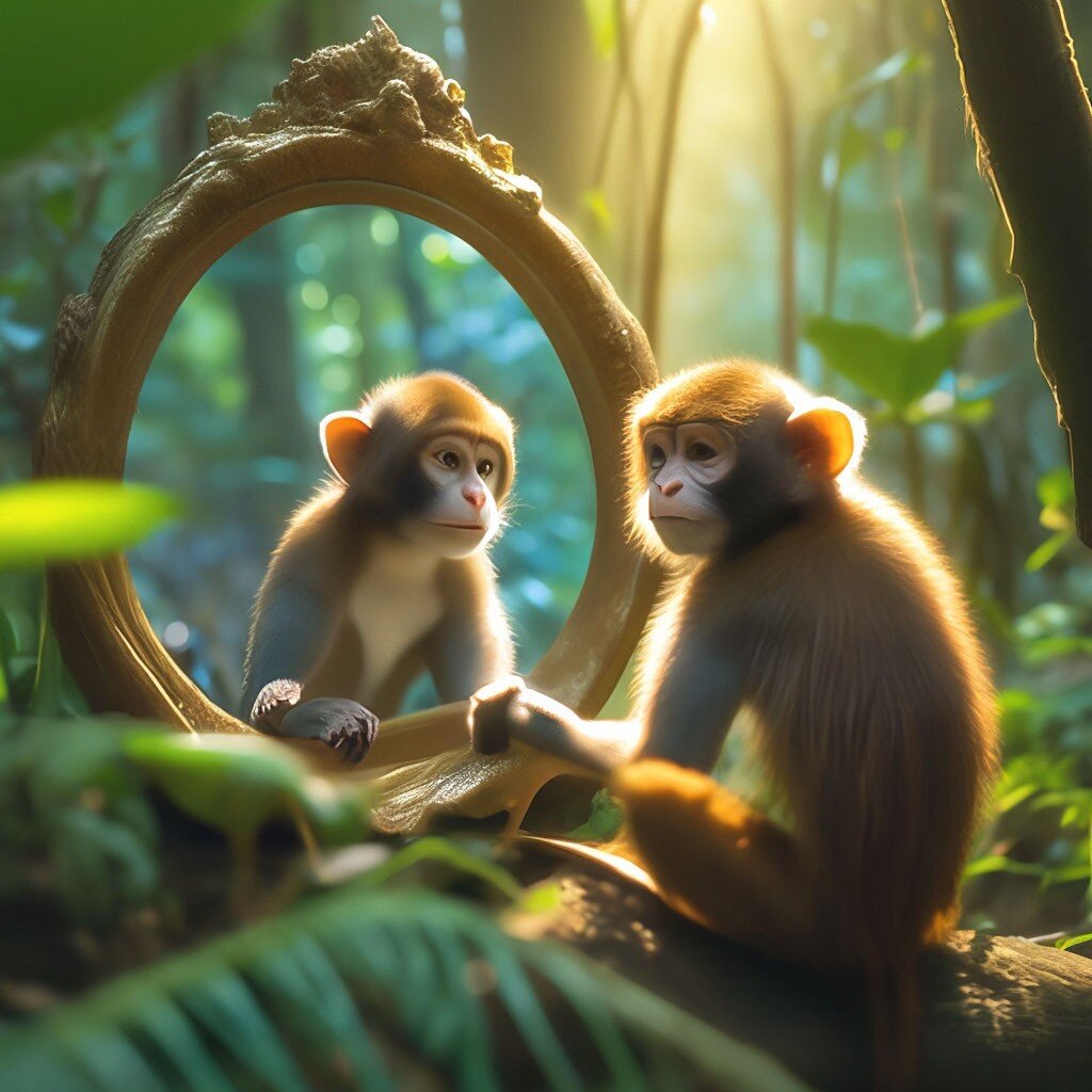 Жила-была обезьяна по имени Мила. Она была очень любознательной и всегда искала новые приключения. Однажды, во время своей прогулки по джунглям, Мила наткнулась на что-то блестящее и загадочное - это было зеркало. Мила никогда раньше не видела зеркала и была заинтригована его отражением. Она подошла ближе и увидела свое отражение в нем. Обезьяна была потрясена тем, как точно зеркало повторяло ее движения. Мила стала играться перед зеркалом, делая разные гримасы и позы. Она была очарована своим отражением и не могла оторваться от зеркала. Казалось, она нашла нового друга, который всегда будет с ней. Но постепенно Мила начала осознавать, что ее отражение не может с ней разговаривать или играть в прятки. Зеркало было только отражением ее самой. Обезьяна почувствовала некоторое разочарование. Однако, Мила не сдалась. Она решила использовать зеркало для чего-то полезного. Она начала изучать свое отражение, обращая внимание на свою мимику и позы. Мила стала исправлять свои недостатки и улуч