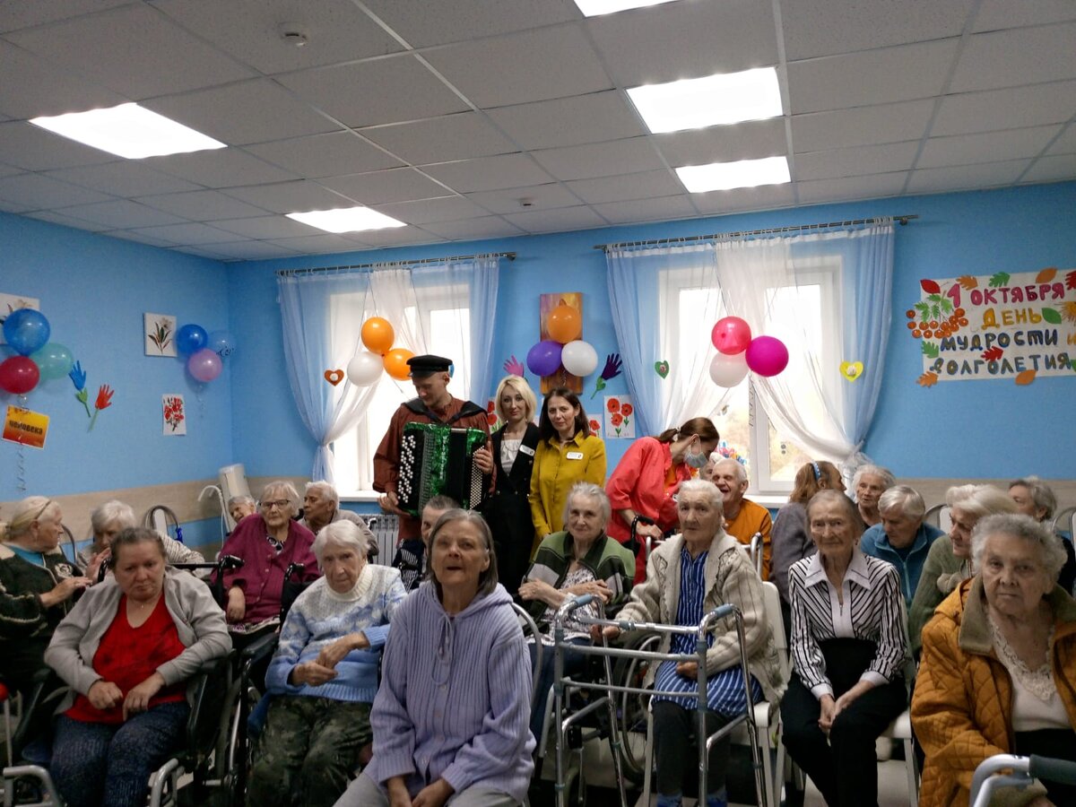 1 октября в мире отмечают День пожилого человека. Это отличный повод поговорить о том, что так ценим в людях старшего возраста: их мудрости, жизненном опыте, здоровье, доброте. В каждом пансионате сети "Забота и уход" мы постарались создать тёплую душевную атмосферу, поблагодарить еще раз бабушек и дедушек за все, что они сделали для молодого поколения, и, конечно, развлечь их, исполнив вместе с ними любимые ретро-песни. В "Красногорский" поздравить пожилых людей приехал профессиональный гармонист Евгений. Вместе с подопечными он исполнил шлягеры советского времени. Уравляющая пансионата Илона Дмитриевна (в черном пиджаке, стоит) с коллегами и подопечными. Команда "Красногорского" заранее украсила холл в осенних цветах. В "Пыхчеве" помимо сладостей к чаю подопечным подали арбуз - чтобы насладиться вкусом лета. В "Химках" тоже устроили праздничный обед. Собрались все вместе, за одним столом. Посиделки в уютной столовой в "Молокове": чаевничать со сладостями после концерта здесь ста
