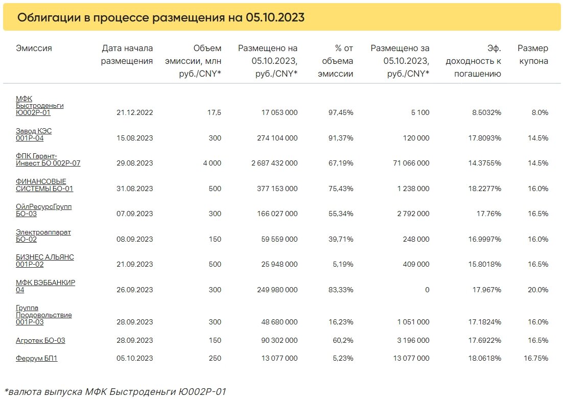 Коротко о торгах на первичном рынке 5 октября стартовало размещение дебютного выпуска Феррум БП1. Пятилетние облигации объемом 250 млн рублей с ежемесячным купоном 16,75% были выкуплены в первый день на сумму 13,1 млн рублей. ООО «Феррум» — небольшое по меркам российского корпоративного сектора торговое предприятие, специализирующееся на оптовой торговле металлопрокатом для нужд судостроительной и судоремонтной отраслей. Напомним, что АКРА в июле 2023 г. присвоило эмитенту кредитный рейтинг BB-(RU) со стабильным прогнозом, отметив хорошую географическую диверсификацию продаж и низкую долговую нагрузку компании. Также отметим выпуск ФПК Гарант-Инвест БО 002Р-07. За день было выкуплено облигаций на сумму 71 млн рублей. Общее количество сделок за день составило 34, из них 20 были с объемом более 1 млн рублей. Объемы двух максимальных заявок 12 и 11 млн рублей. Всего выкуплено бумаг на сумму 2,7 млрд (67,2%) из 4 млрд рублей общего объема эмиссии. Несмотря на падение рубля, хорошим спросо