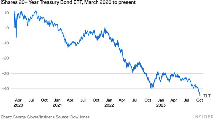 В период с марта 2000 года по октябрь 2022 года высокотехнологичный индекс Nasdaq Composite упал на ошеломляющие 72%, потеряв все свои достижения за предыдущие пять лет Цены на облигации США резко упали в последние недели, превратив то, что и без того было плохим периодом, в одно из худших поражений рынка за всю историю. Доходность 10- и 30-летних казначейских облигаций США приближается к 5% впервые с 2007 года, а инвесторы обеспокоены тем, что Федеральная резервная система сохранит процентные ставки на текущем уровне вплоть до 2024 года в попытке остановить инфляцию. По данным Bloomberg, длинные облигации никогда не переживали такого плохого состояния: потери, которые этот класс активов понес с марта 2020 года, даже превысили ужасный период 1980-х годов, когда ФРС подняла стоимость заимствований до 16%. За последние три с половиной года 20+ Year Treasury ETF iShares, который торгуется под тикером TLT и отслеживает цены на долгосрочные государственные облигации, упал на ошеломляющие 44