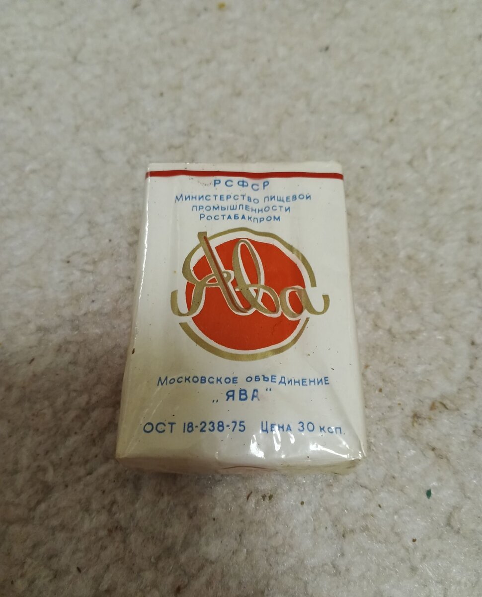 В СССР особой ценностью отличались сигареты "Ява" в мягкой пачке. Потому я взял именно их, хотя был вариант приобрести эту же марку в твёрдой упаковке. Приехали они ко мне в отличном состоянии. На фотографии видно, что у них даже плёнка не повреждена. Пачка выглядит интересно. Она выполнена из мягкой бумаги по аналогии, как раньше делали американские сигареты Camel. Чтобы достать сигарету из пачки, необходимо было оторвать кусочек "фольги" и простым движением большого пальца ударить по низу пачки. В тот же момент высовывалась сигарета.
