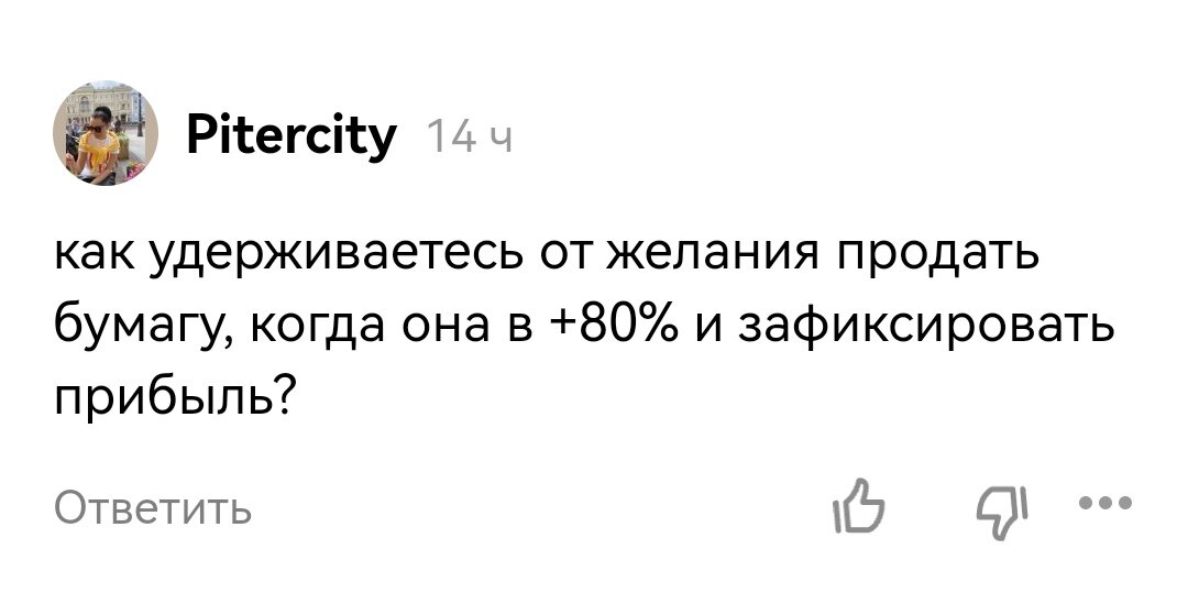 «Как вы удерживаетесь от желания продать актив, который вырос на 80 %, и зафиксировать прибыль?» - поступил вопрос, отвечаю