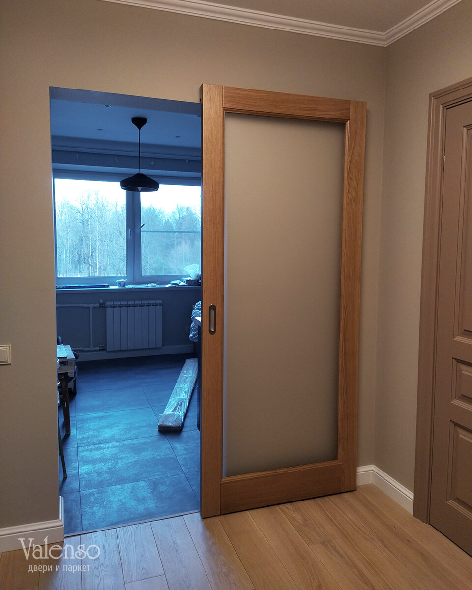 Сдвижная в стену дверь — достаточно популярное и функциональное решение. Оно позволяет поставить дверь, так где стандартное распашное полотно может не уместиться, или не подходит по концепции интерьера. Но во время проектирования сдвижной в стену двери в вашем интерьере, вы должны учитывать, что необходимо будет установить пенал внутри этой стены! И толщина такой конструкции должна учитывать толщину полотна двери, толщину пенала для двери и самой перегородки. А что делать, если невозможно предусмотреть такой пенал? Решение есть! Это сдвижная дверь вдоль стены. По своей сути оно полностью обладает функционалом сдвижной двери, но полотно заходит не внутрь стены, а сдвигается вдоль. При этом может возникнуть сомнения по поводу эстетичности видимых механизмов — так вот их не видно! На этих фотографиях вы видите нашу работу в интерьере квартиры, расположенной в Гатчине, мы установили несколько межкомнатных дверей. И в частности одинарная сдвижная вдоль стены дверь со скрытым механизмом.
