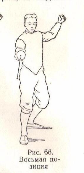 Продолжаем изучение защит. В прошлой статье мы посмотрели технику 6 и 4 защиты, которые защищают верхний сектор Переходим к позициям, которые закрывают нижний сектор. 8-я позиция закрывает от уколов внешний нижний сектор. Острие направлено под оружие противника в его нижний внутренний сектор. Кисть, повернутая ладонью вверх и немного влево - ногти вверх, находится на уровне нижней границы груди. Острие ниже гарды на уровне таза и направлено вперед-вниз. В отличие от второй позиции гарда не выходит снаружи за контур поражаемого пространства. Сходна с 7-й, но оружие находится справа 7-я позиция принимается по отношению к нижнему внутреннему сектору. Оружие находится против левого, внутреннего, контура своего поражаемого пространства. Вооруженная рука полусогнута слева под тупым углом, гарда на высоте груди. Кисть повернута ладонью влево - ногти вверх - и находится на уровне нижней границы груди. Острие ниже гарды на высоте середины бедра, несколько левее ее (сантиметров на 10), и напр