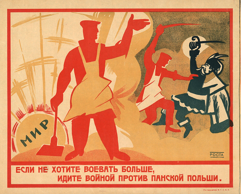 Самое любопытное, что Черемных и Малютин, как локомотивы стиля «Окон РОСТА» разработали для всех остальных почти единый стиль- так чтобы все персонажи были узнаваемы сразу. Если Врангель – то папаха, гильзы на мундире, усы, если поляки – то все элементы польской формы (и тоже усы), если советский рабочий – то в красной рубахе и обязательно – в красной кепочке. И только у одного автора персонажи выглядят совсем по-другому – например, советские мужчины – с длинными волосами. Этого автора звали Алексей Сергеевич Левин и все его работы можно определить по этим деталям. Вот, например Окно РОСТА № 347. Если помнишь время злое и зверей различной масти