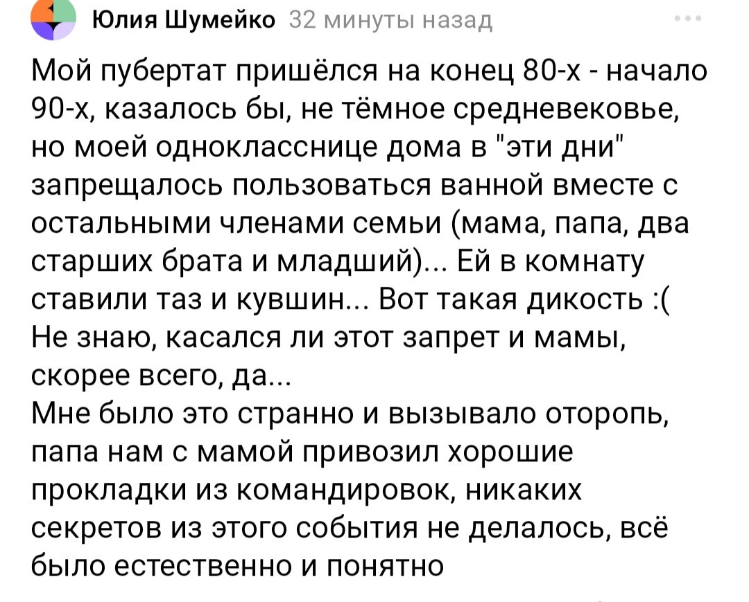 Нет, “демонизации” нам однозначно не надо. Хочется верить, что специальные хижины, “отселения” девушек и женщин, другие запреты и ограничения, пусть и не в нашей культуре, но скорее уйдут в прошлое. Но просто посмотрите на этот комментарий. Я потом уточнила, происходило ли это в России. Да, Ленинград, 89-ый год.
