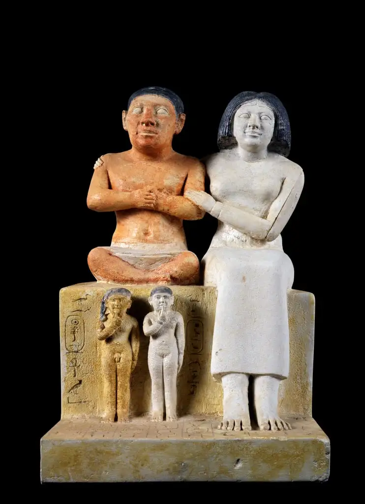 Сенеб изображен со своей женой и детьми на раскрашенной скульптуре из его гробницы, которая является известным образцом искусства Древнего царства.
