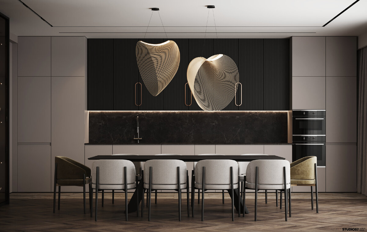 Фасады кухонных шкафов были выполнены в нейтральных светлых тонах, однако, чтобы добавить интерьеру характера, дизайнеры решили использовать контрастные фрезерованные графитовые фасады второго уровня. Эти графитовые акценты придали кухне динамику и структуру, создавая необычный и запоминающийся облик. Для дополнительной оригинальности, дизайнеры выбрали необычные ручки, которые стали ярким акцентом на фасадах. Они не только функциональны, но и служат элементом декора, подчеркивая индивидуальность интерьера.
