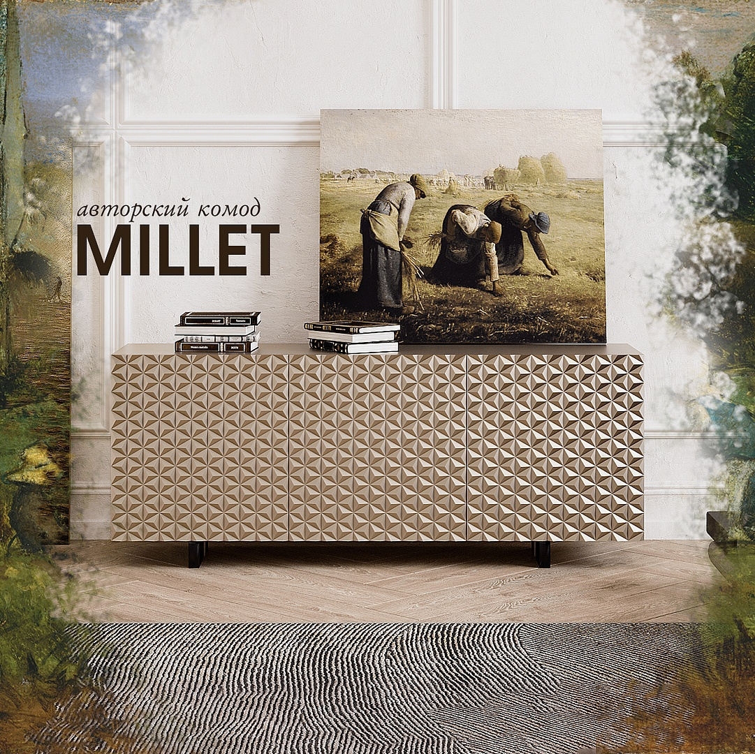 MILLET- предельный лаконизм. Идея данного комода навеяна творчеством французского художника Жана-Франсуа Милле. Комод MILLET представлен в двух фрезеровках и трёх размерах Вариации фрезеровок охарактеризованы многогранностью творчества Милле. Три вида размеров, это ничто иное, как три жанра работ Милле - портретный, бытовой, пейзажный. Каждый элемент фрезеровки - это отражение философии Милле. Ручная работа - это титанический труд. Объемность фрезеровки подчеркнута минималистичными простыми ножками. А ровная цветовая гамма всего комода - это влияние направления "реализм", которое в середине 19-го века заняло ведущее место в изобразительном искусстве Франции.