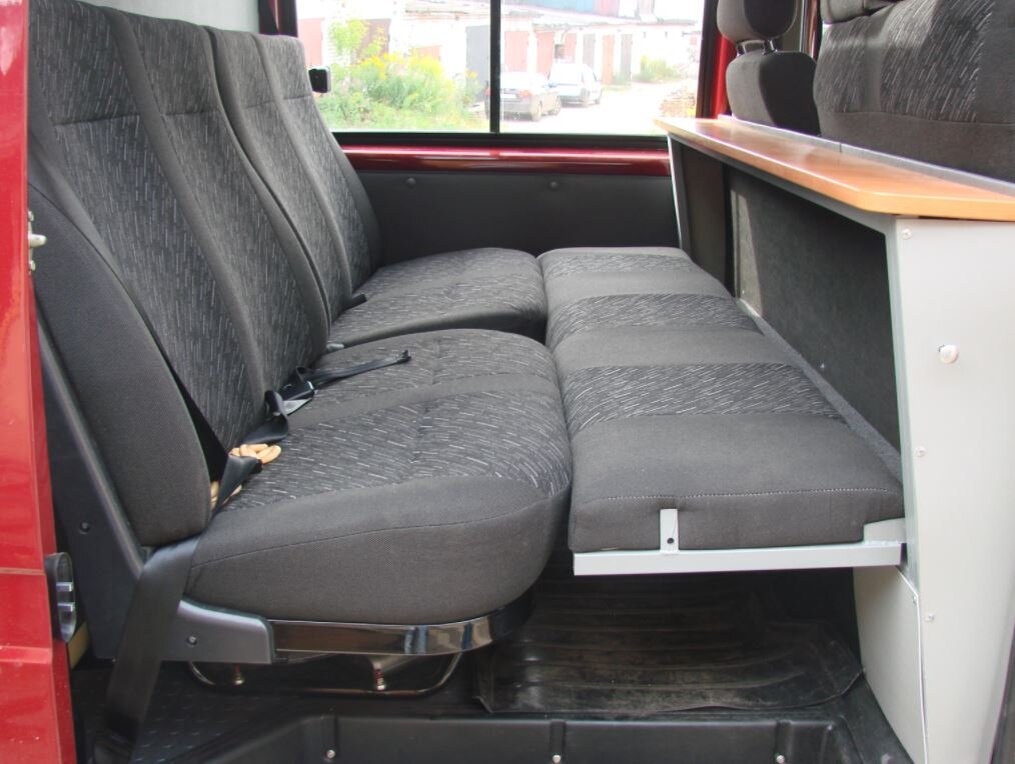 Мы вам поможем, у нас есть диван со столиком. В сложенном виде - полочка с откидывающимся столиком, в разложенном – полноценная широкая кровать. Очень удобно и с ветерком можно разместиться в салоне и отдохнуть. Благодаря встроенному складному столику, пассажиры второго ряда, как во время стоянки, так и во время движения, могут комфортно пообедать. Упругая поверхность дивана, крепкий механизм раскладывания – то, что нужно для комфорта в салоне семиместной Газели Бизнес. Заказывайте у нас диван-перегородку для семиместной Газели Бизнес