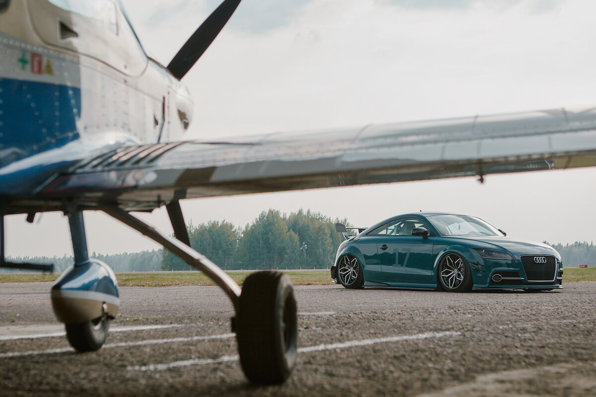 Дизайн первого поколения Audi TT был придуман в Калифорнии. Получается, этот регион США подарил нам технику Apple, губернатора-Терминатора и одно из самых необычных немецких купе. Впечатляет, ничего не скажешь. Александр проживает в городе Минск и обладает редким для белоруса качеством: ему совершенно не импонирует Passat B3. Его автопарк - квинтэссенция анти практичности, апофеоз стремления владеть исключительно заряженными версиями машин. Нет литеры “S” в названии - нет интереса. Audi TT 3.2 quattro для него - это в первую очередь спортивное купе, R8 для тех, кто по какой-то причине не хочет покупать суперкар. Но он настолько преисполнился в своей мысли, что жене тоже решил купить ТТ. Чтобы не путать во дворе на парковке - ТТ кабриолет. Возвращаясь к машине Александра, её тюнинг вылился в сложный и несвойственный этим купе процесс. Часто к этим машинам прибивают недорогие универсальные расширители, спойлеры из Китая - обязательно саморезами - и прочие экстравагантные элементы стай