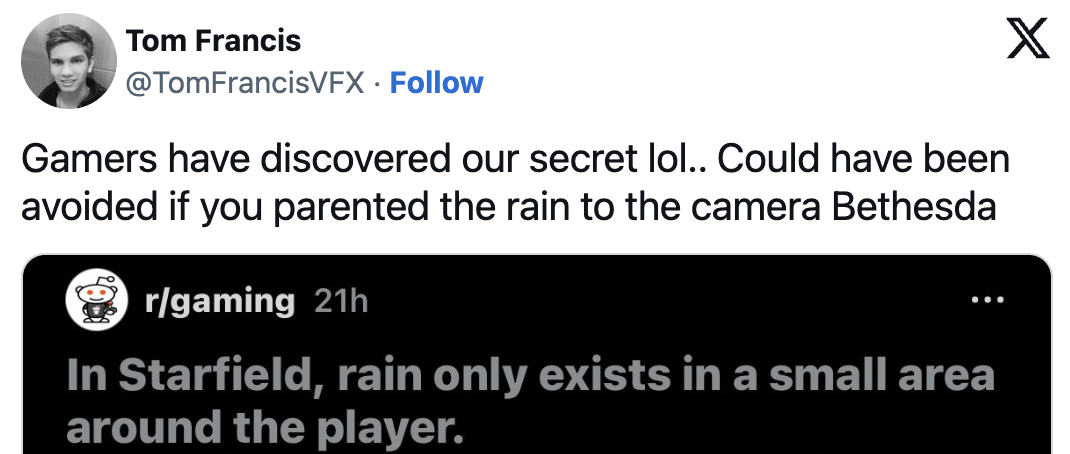 После того как игроки Starfield осознали, что система дождя в игре — это просто "короб", который разработчики размещают вокруг персонажа для имитации погодного явления, разработчики из разных студий решили поделиться своими "хитростями", которыми они обманывают геймеров. Все началось с поста на Reddit, в котором продемонстрировали, что дождь в Starfield — это всего лишь ограниченное количество капель, падающих на локализованное пространство. Как выяснилось, это общепринятая техника, которую разработчики используют, чтобы создать иллюзию дождя везде, экономя ресурсы на рендеринг огромного количества капель. Том Фрэнсис, главный художник по эффектам из Red Hook Games, отметил, что Bethesda могла бы избежать этого, если бы просто прикрепила "короб дождя" к камере, а не к модели персонажа. Создатель Iron Lung, одной из самых страшных инди-игр 2022 года, был шокирован, что игроки узнали об этом обмане. Другие разработчики присоединились к дискуссии, чтобы рассказать о интересных трюках в ра